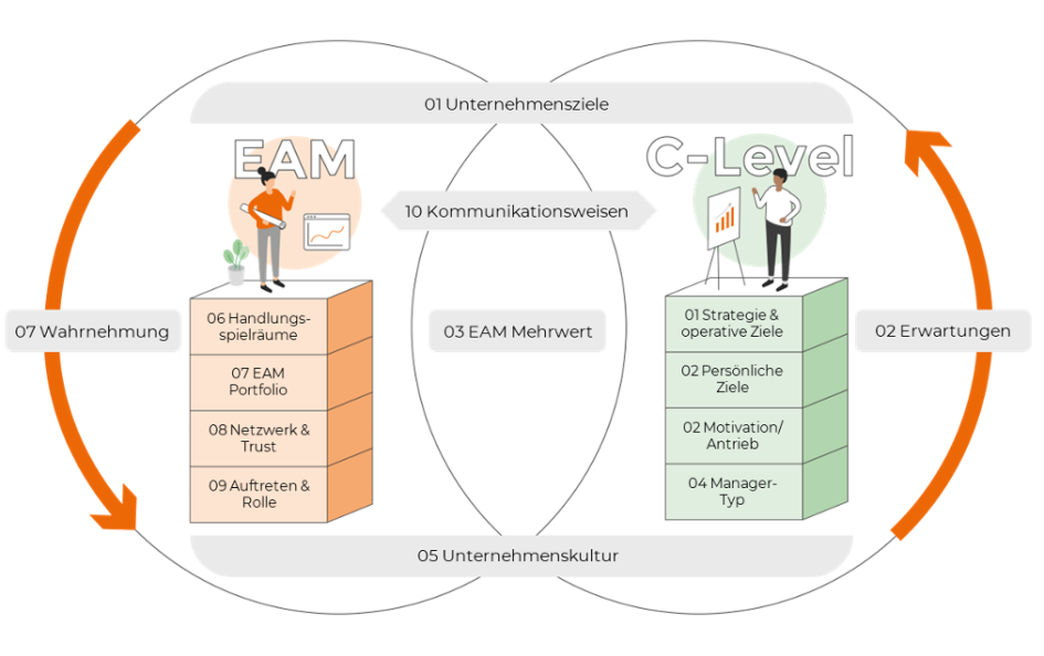 First of all, there are technical factors (1.-3.), issues, content, facts, followed by soft factors such as personality, language and culture (4.-10.). Overall, it is about successfully addressing the top management of the company from within Enterprise Architecture Management, both in IT and in the business. This does not just mean the C-level, i.e. the board of directors, management, owners, but all managers who have their own business decision-making powers, i.e. also plant managers or branch managers, etc.