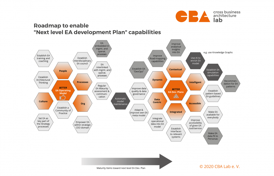 Um den Next-Level-Bebauungsplan umsetzen zu können, müssen Enterprise Architecture als Ganzes, aber auch das Artefakt Bebauungsplan weitere Fähigkeiten entwickeln. So sollte EA nach Auffassung des Workstreams nicht nur in der operativen IT, sondern auch als strategisches und cross-funktionales Planungs- und Managementwerkzeug genutzt werden.